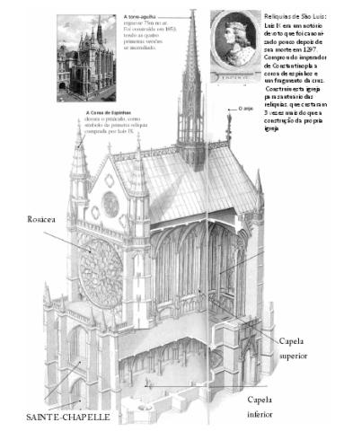 A igreja foi construída a pedido de São Luis para guardar a coroa de cristo, que hoje está em Notre Dame e é uma das supremas realizações da Idade Média, há mais vitrais do que pedras. A área das janelas soma a maior extensão existente de vitrais em todo o mundo, cobre uma área de cerca de 620 m² e seus incríveis vitrais representam mais de mil cenas bíblicas, vale a pena levar um binóculo para ver os detalhes. Nessa pequena caixa de jóias góticas são realizados concertos de música erudita ao entardecer à luz de velas. Tem dois andares a capela baixa destinada aos servidores.